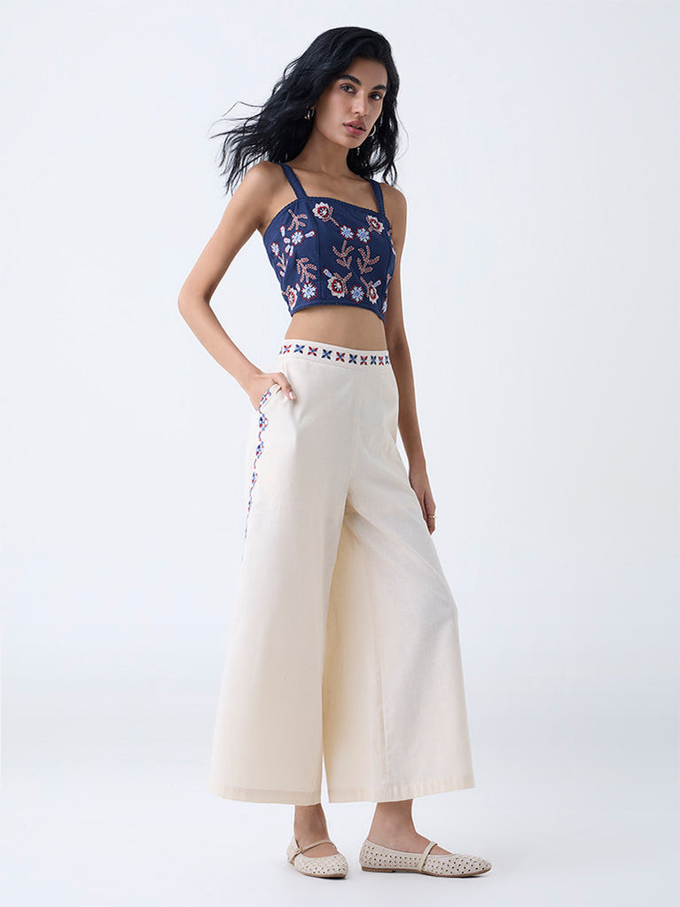 Bombay Paisley Indigo Floral Embroidered Cotton-Blend Top