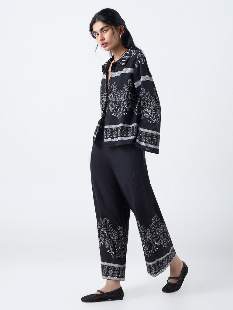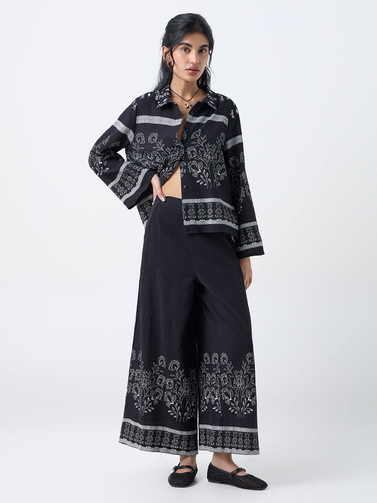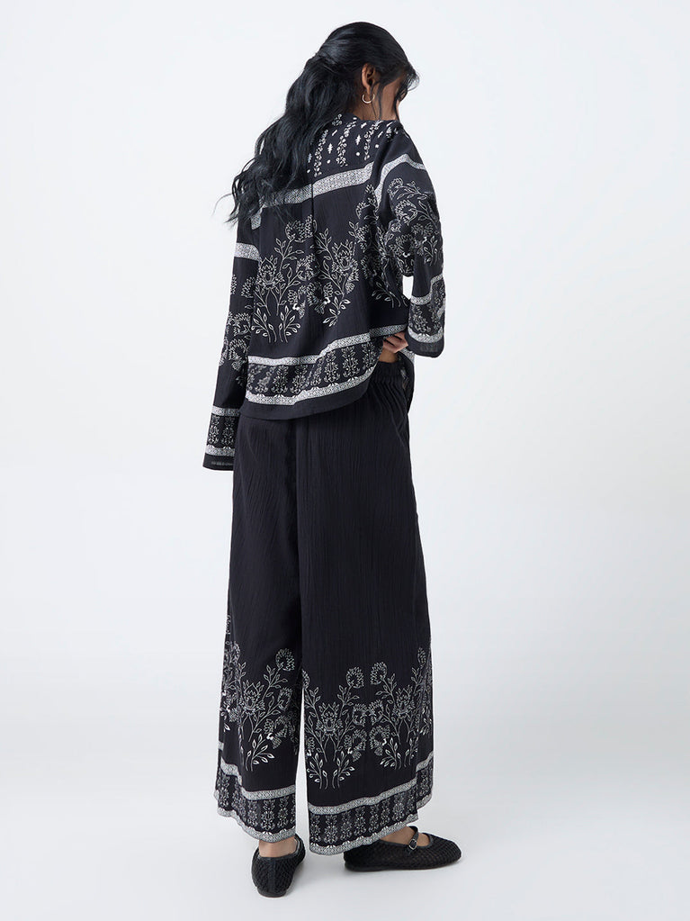Rooted in effortless Indo-western charm, these black palazzos from Bombay Paisley are covered in dainty floral motifs for a softly expressive look. Made from pure cotton with a lightweight crinkle texture, they offer a relaxed silhouette supported by an elasticated waistband and side pockets.