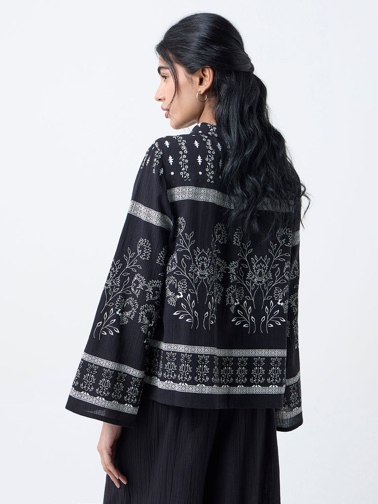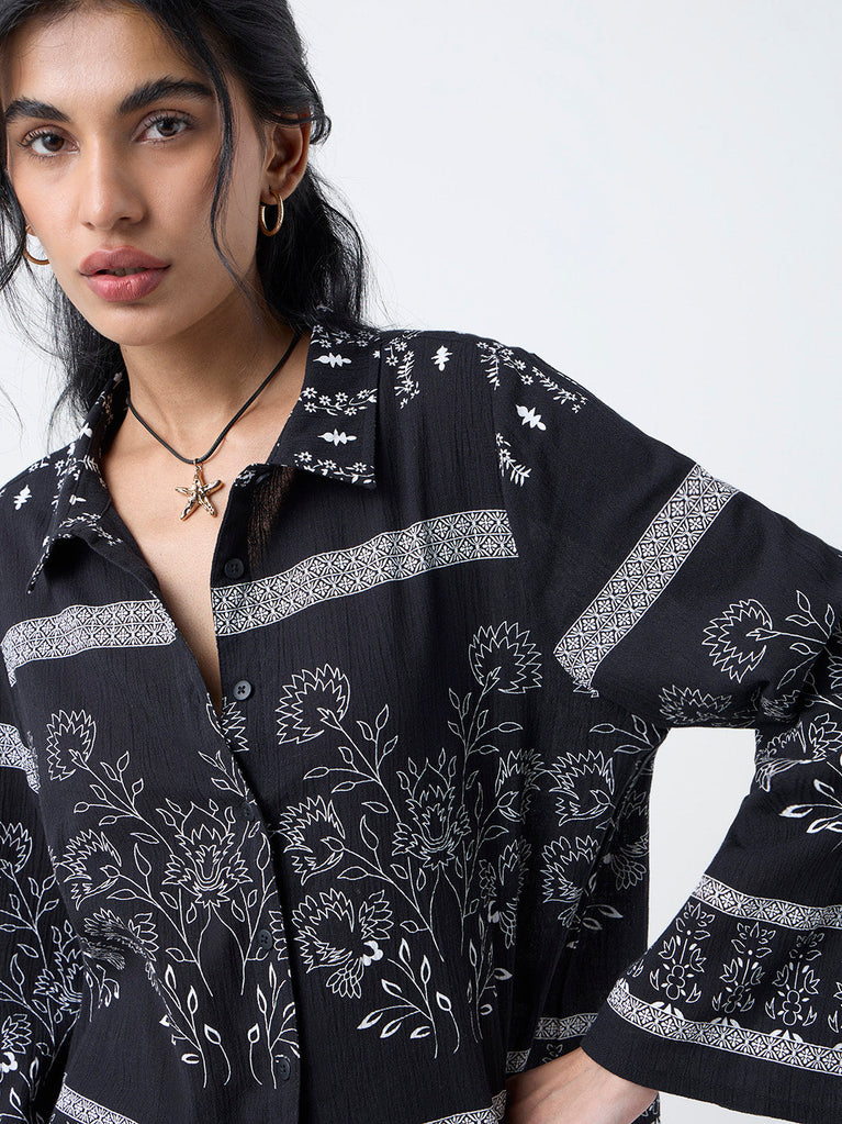 Bombay Paisley brings an artisanal touch to everyday dressing with this black crinkle-textured shirt, adorned with delicate floral motifs that echo the brand boho spirit. Crafted from pure cotton for breezy comfort, it features a relaxed collar, a fluid button placket and softly flared sleeves that sway with movement.