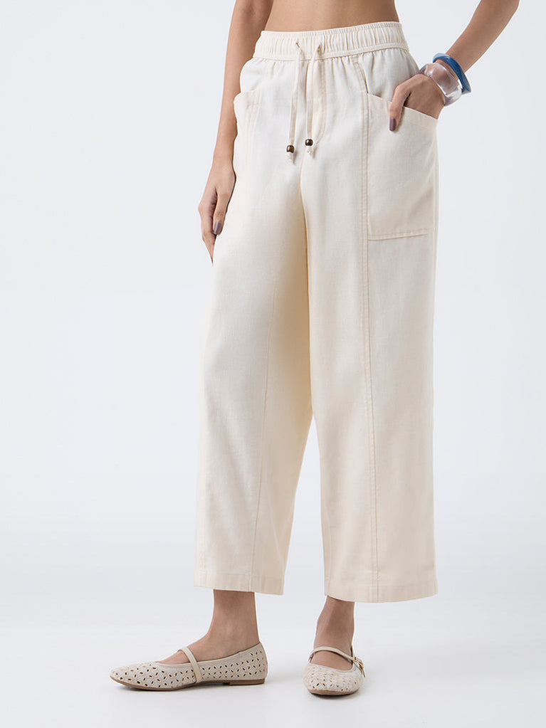 These off-white cotton-blend pants from Bombay Paisley lean into a clean, contemporary aesthetic. The fabric feels light and comfortable, balanced by a relaxed fit that suits all-day wear. A drawstring waist and functional pockets add thoughtful touches.