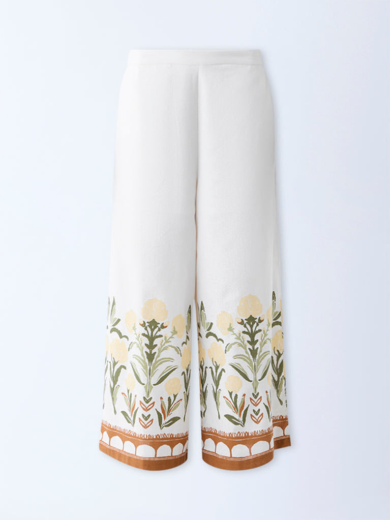 Bring a contemporary twist to your outdoor edit with these white palazzos from Bombay Paisley. Patterned with a lively foliage print, they’re made from a soft cotton blend for breezy comfort. The smooth elastic waistband and side pockets add everyday ease, making them a versatile pick for both casual and festive pairings.