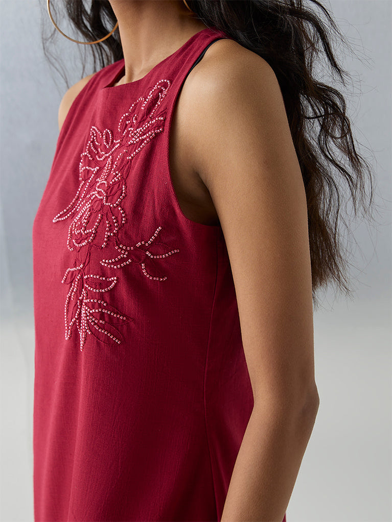 Bright and effortless, this red cotton shift dress from Bombay Paisley features delicate floral embellishments that lend a touch of charm. Designed with a classic round neck and a sleeveless cut, it offers a breezy silhouette that’s perfect for warm, sunny days and casual outings.