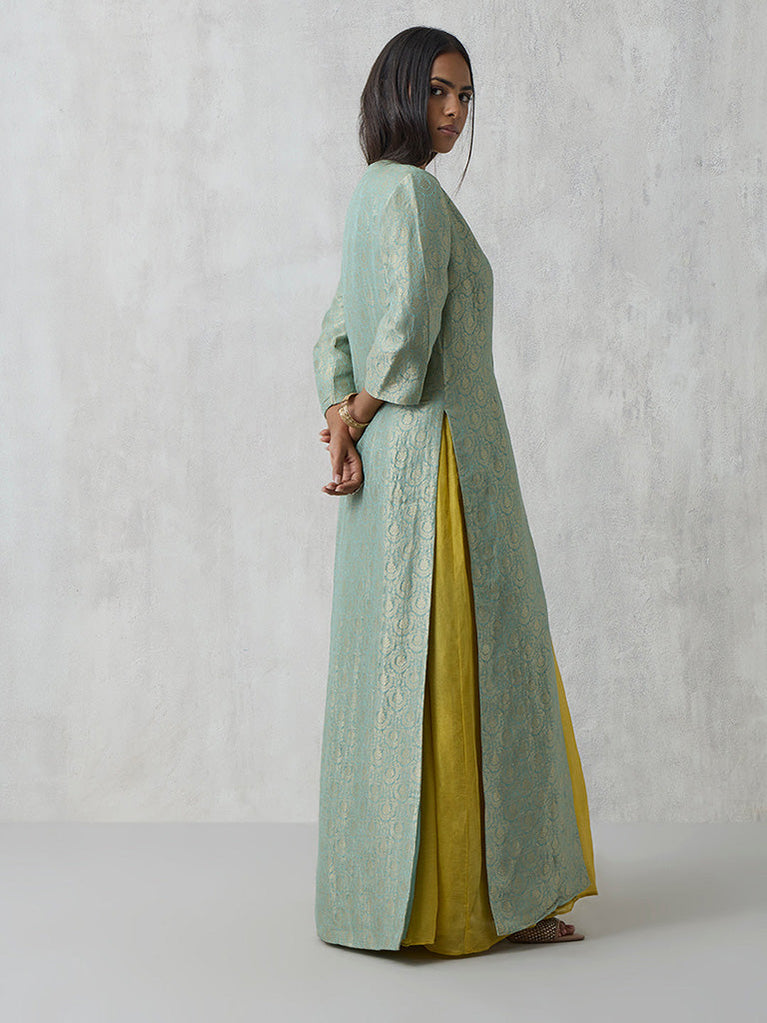 Striking a perfect balance of modern elegance and festive flair, this two-piece set pairs a flowing yellow maxi dress with a statement longline jacket. The sleeveless dress is tailored in a fluid silhouette with a soft sheen that moves gracefully with every step. Layered over it, the aqua brocade jacket shimmers with intricate woven motifs, finished with a clean round neckline and three-quarter sleeves.
