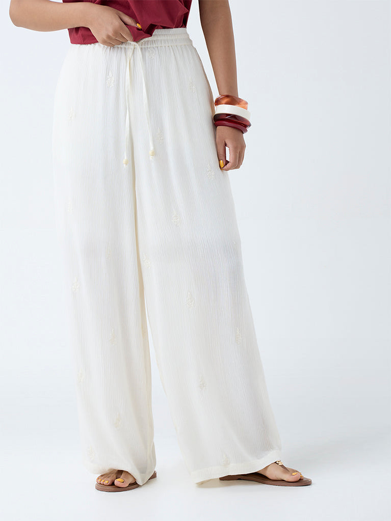 These white ethnic pants from Diza are a versatile staple with elevated accents. Created from a breezy fabric, they flaunt floral embroidery along the hems for a refined finish. An elasticated waistband with drawstring ties ensures comfort, while side pockets add a touch of practicality.