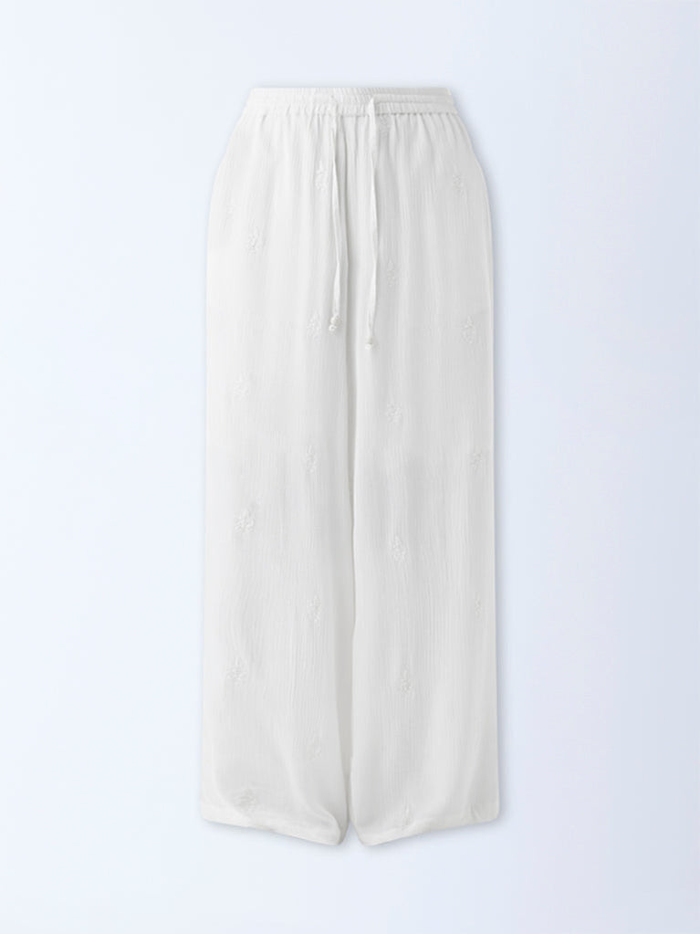 These white pants from Bombay Paisley are made from a crinkle-textured fabric that brings subtle dimension to your off-duty looks. Embroidered detailing adds a touch of character, while the elasticated waistband with adjustable drawstrings ensures a personalised fit. Finished with side pockets for added function, they’re an easygoing essential made for relaxed days.