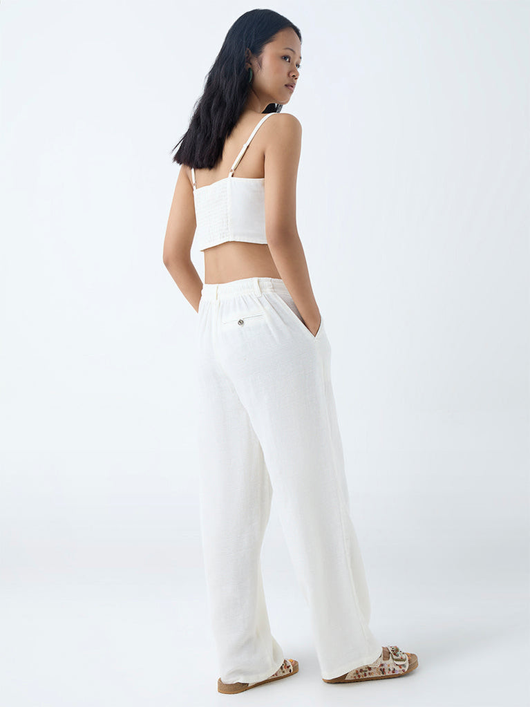 These off-white pants from Bombay Paisley blend everyday ease with understated charm. Woven from a cosy cotton-blend fabric, they feature a clean silhouette with an adjustable drawstring waistband for a comfortable fit. Multiple pockets complete the look with a touch of practical detail.