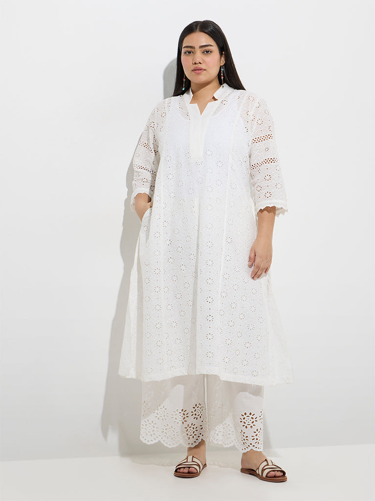 Diza White Schiffli Detailed Cotton Ethnic Pants
