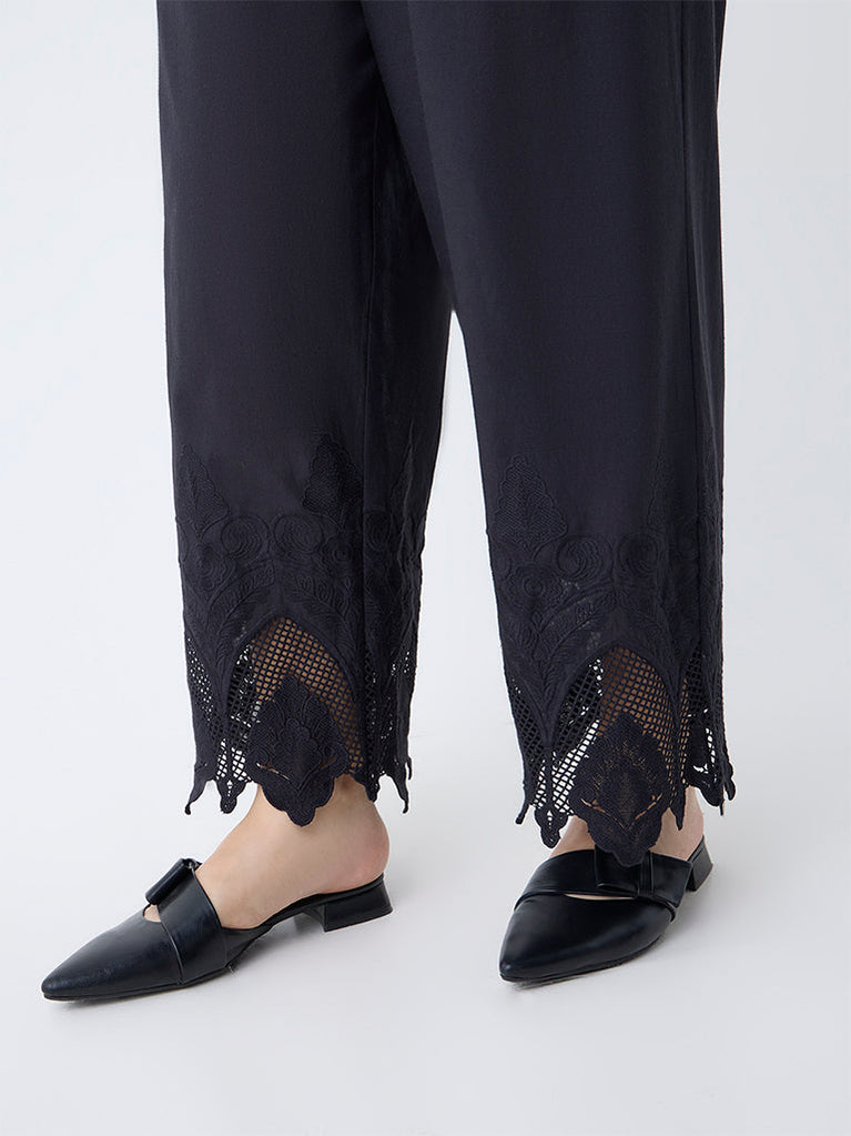 Diza Black Embroidered Cotton Pants