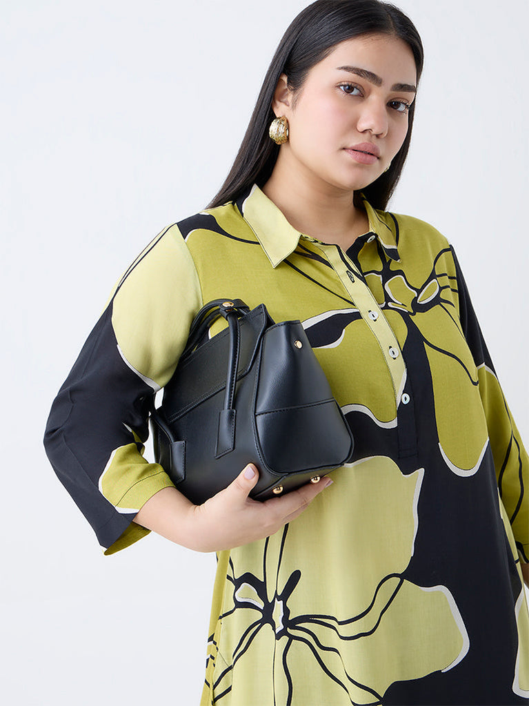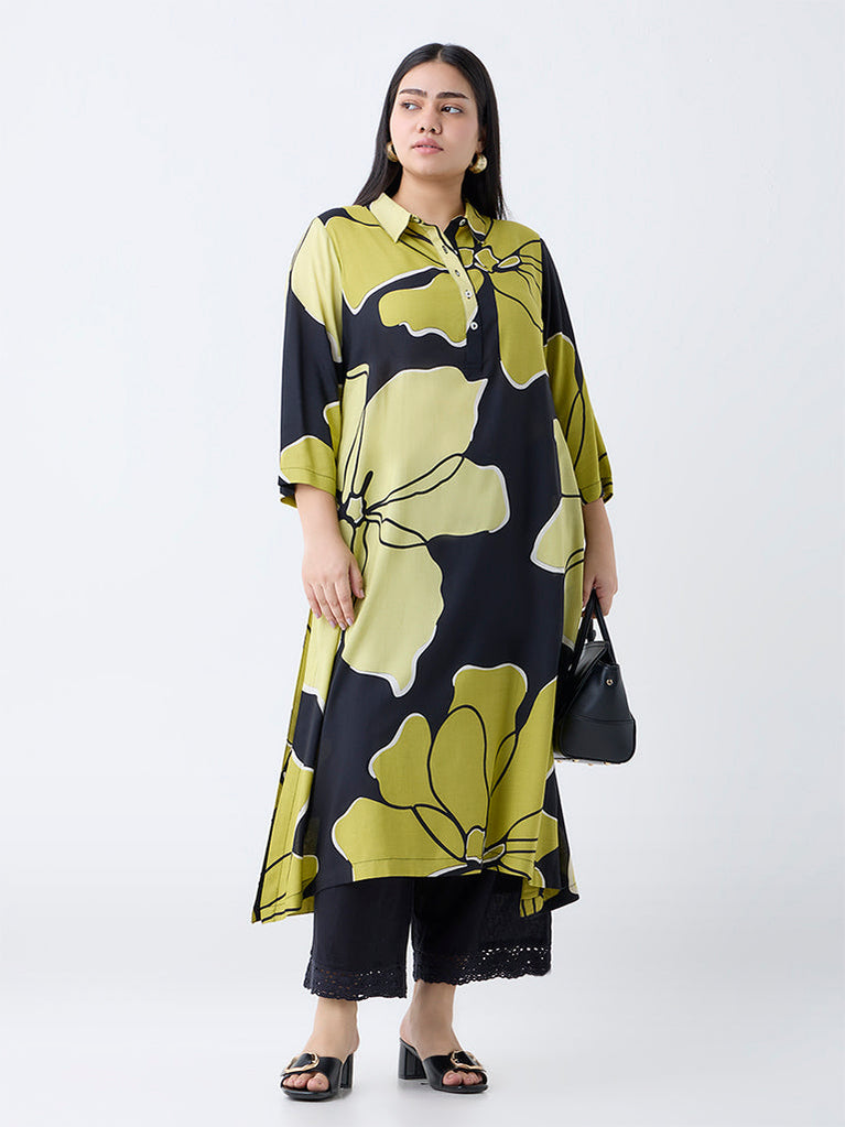 Diza brings you this charming black A-line kurta, featuring graceful floral prints that add a hint of femininity. Styled with a refined spread collar leading to a brief button-down front, three-quarter sleeves, and convenient side pockets, it combines effortless elegance with practical design.