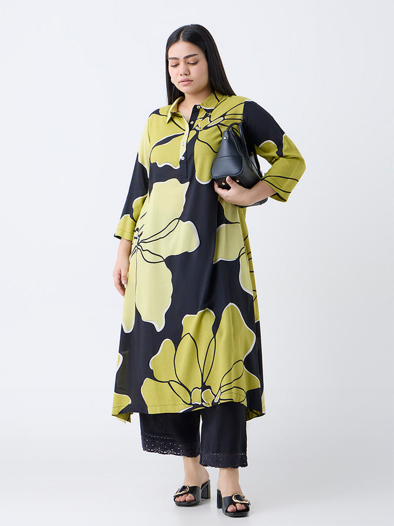 Diza Black Floral Design A-Line Kurta