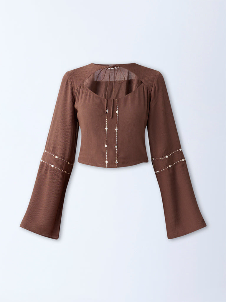 Reimagine casual chic with this brown top from Bombay Paisley. Spun from an ultra-lightweight fabric, it flaunts intricate embroidery on the bell sleeves, adding subtle elegance. The cut-out detail at the front, paired with a playful tie-up design, gives it a contemporary edge.