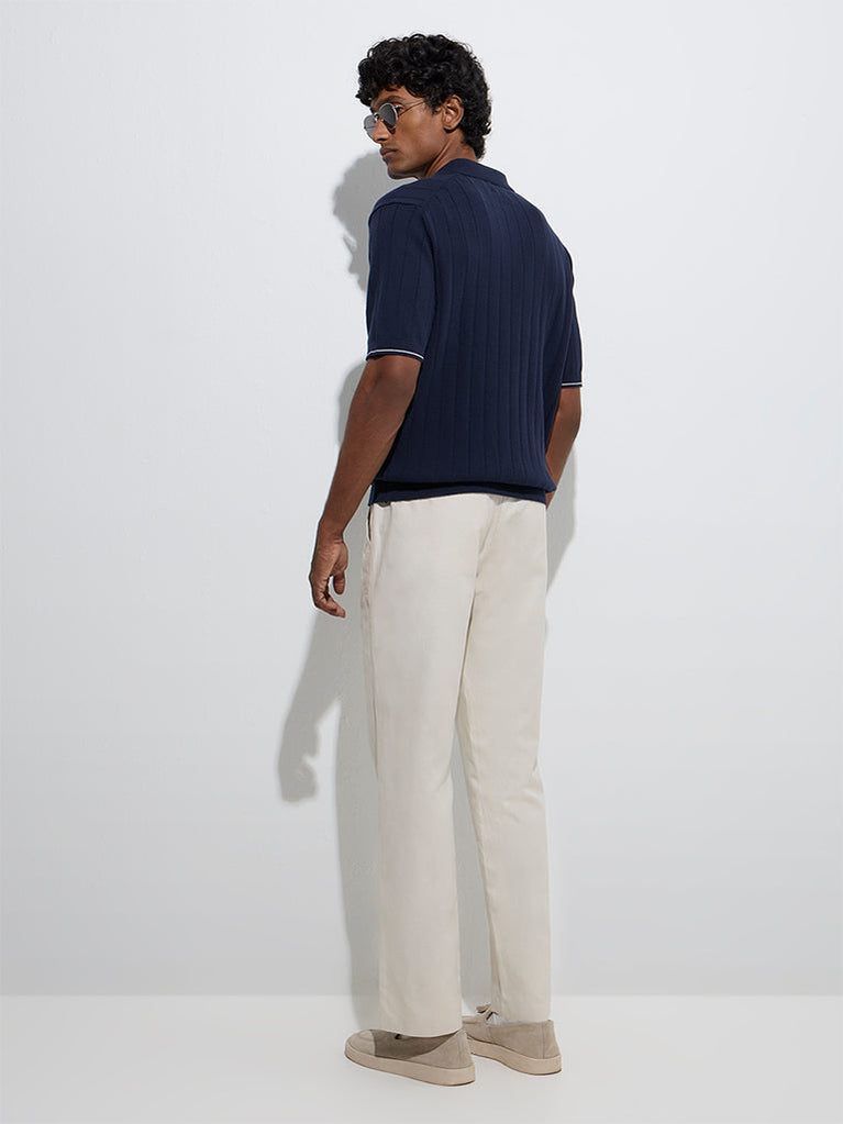 This off-white polo t-shirt from Ascot highlights self-stripes that lend depth to its refined look. Constructed from a stretch-infused cotton-blend material, it features a spread collar with a quarter-zip detail, half sleeves, and a ribbed hem that ensures a structured yet comfortable fit.