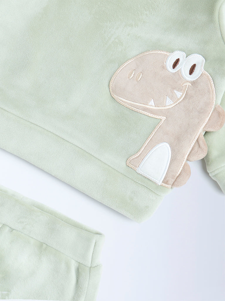 This adorable sage co-ord set by HOP Baby features a soft fleece sweatshirt with a playful dinosaur appliqué and matching joggers. Designed with ribbed cuffs and an elasticated waistband, it offers cozy comfort and easy movement for everyday play.