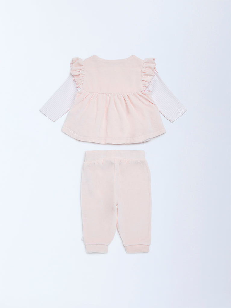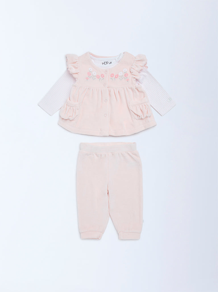 HOP Baby presents this pink set crafted for everyday comfort. The top features floral embroidery, ruffled details and a button placket. It is layered over a soft striped inner tee for added warmth. The coordinating pants come with an elasticated waist and cuffed hems to ensure a snug, easy fit. Made from a cotton-rich fabric, this set offers a gentle feel against the skin, perfect for playtime and cosy days at home.