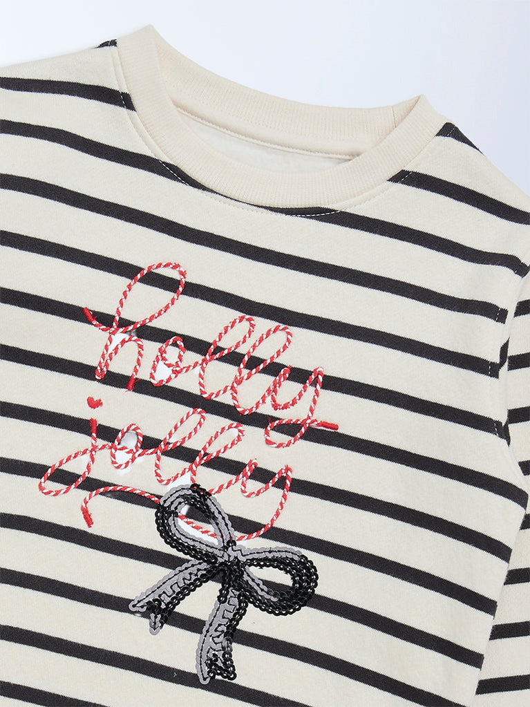 This off-white sweatshirt from HOP Kids brings a festive spirit to winter dressing. It features embroidered texts and an embellished bot detail on a striped printed base. Styled with a round neck and full sleeves, it offers a cosy, easy-wear silhouette for cooler days. The soft cotton-blend fabric construction ensures a utterly smooth and cosy feel.