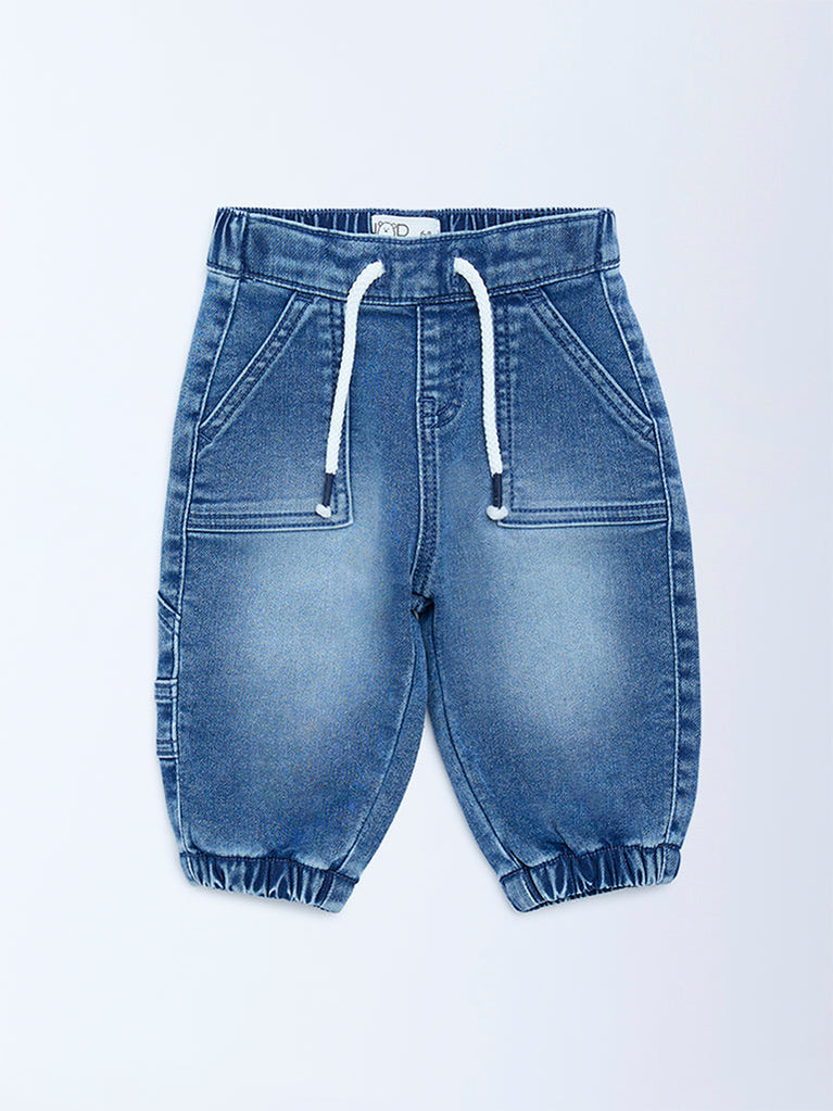 HOP Baby brings a denim-inspired twist to comfort dressing with these blue mid-wash joggers. Designed with a mid-rise waist, they feature an elasticated waistband with drawstrings for a secure fit. Crafted from a soft cotton-blend fabric, this pair ensures ease of movement, making it ideal for everyday playtime.