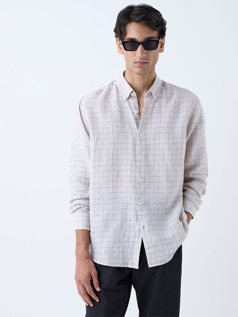 Ascot Beige Checks Design Relaxed-Fit Linen Shirt
