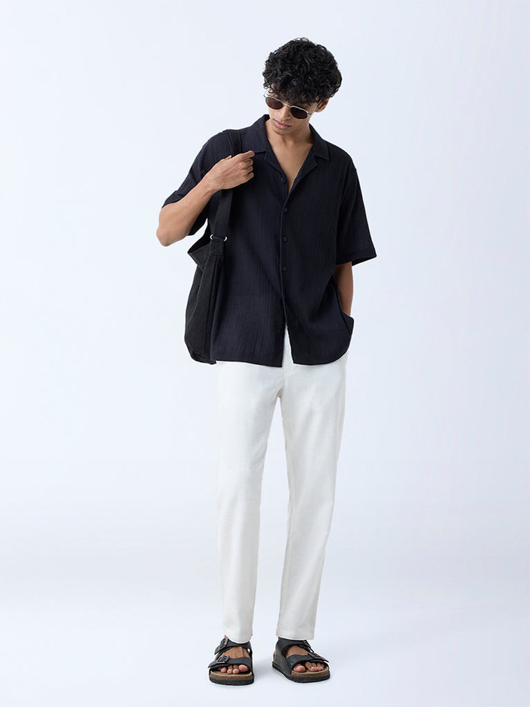 This off-white shirt from ETA channels effortless refinement with its crinkle-textured pure cotton build and relaxed silhouette. Designed with a camp collar, half sleeves, and a button placket, it brings a crisp yet easy-going energy that's perfect for your outdoor edit.