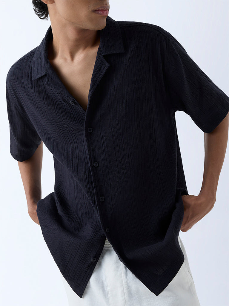 This black shirt from ETA is milled from pure cotton and finished with a subtle crinkle texture for understated character. Cut in a relaxed silhouette, it features a camp collar, half sleeves, and a button placket for easy wear.