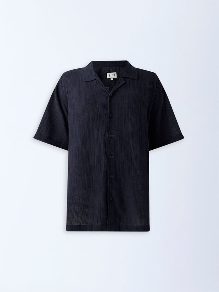 This navy shirt from ETA is tailored in a relaxed fit and crafted from pure cotton with a crinkle-textured finish that adds quiet dimension. Framed with a camp collar, half sleeves, and a clean button placket, it’s a refined essential built for easy transitions between casual and elevated settings.