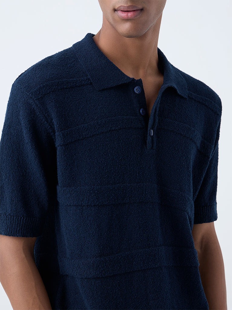 This navy polo t-shirt from ETA is crafted from breathable fabric, enhanced with a textured surface and subtle self-stripes. Designed in a relaxed silhouette, it features a spread collar, short sleeves, and a neat button placket. A versatile staple, it pairs well with denims or chinos for understated casual style.