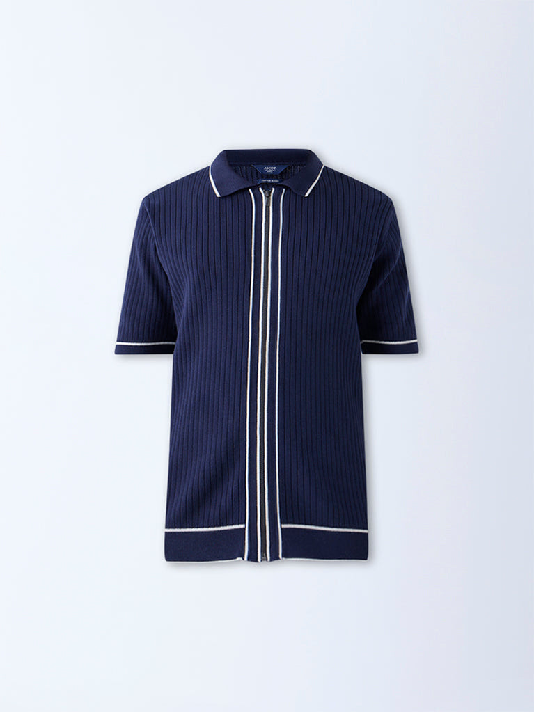 Ascot reimagines casual dressing with this navy polo t-shirt, spun from a soft cotton-blend fabric and finished with a sleek quarter-zip collar for a tailored touch. Its ribbed texture and short sleeves create a streamlined profile.