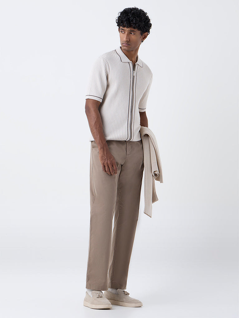 This tan t-shirt from Ascot features a self-striped texture on a premium-blend fabric base. It is sculpted in a relaxed shape with a spread collar, a zipper front and short sleeves, offering an easy yet polished silhouette. An elevated essential, it transitions effortlessly from casual Fridays to weekend outings.