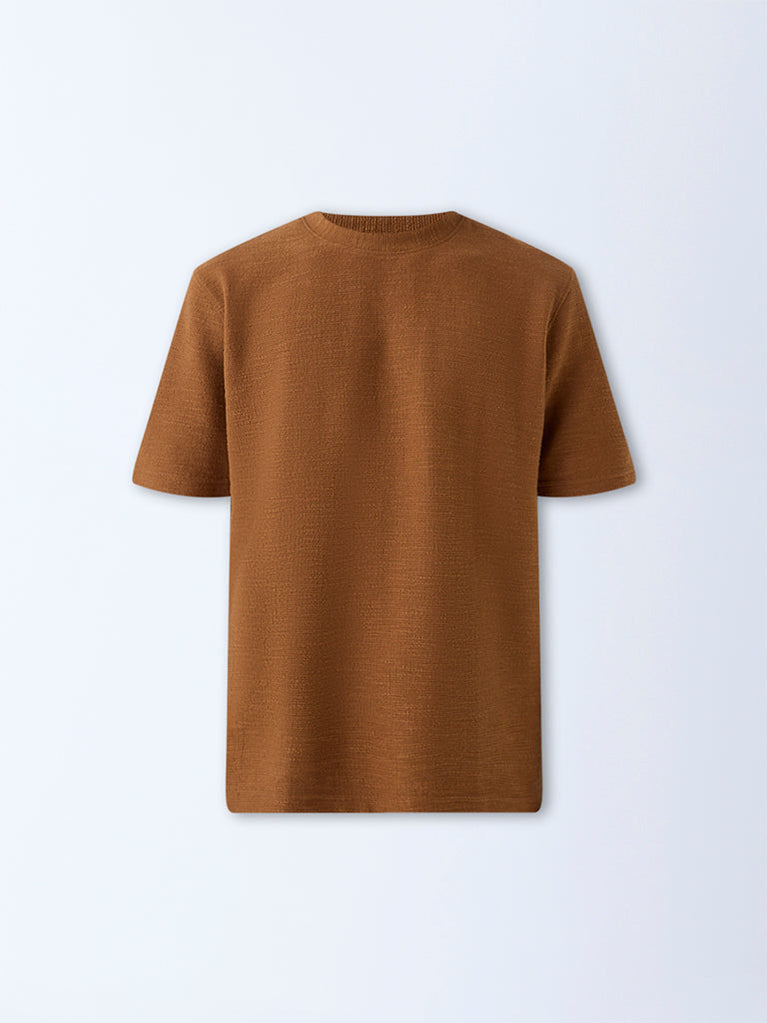 Comfort and style work seamlessly in this brown t-shirt from ETA. Cut from soft cotton with a subtle knit texture, it is styled with a round neck and short sleeves. The relaxed silhouette makes it versatile enough to wear on its own or layered, ensuring effortless appeal for everyday wardrobes.