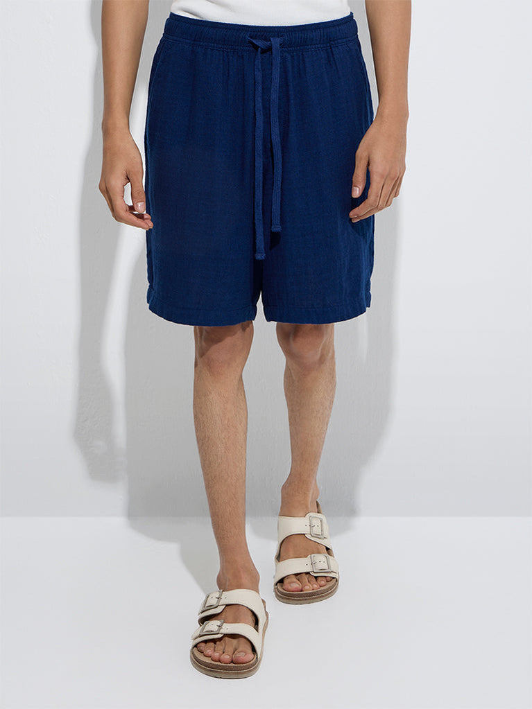 These indigo shorts from ETA are tailored in a relaxed frame for everyday ease. Crafted from a rich cotton-blend fabric, they feature a mid-rise silhouette, smooth elastic waistband with adjustable drawstrings, and multiple pockets for added functionality and style.
