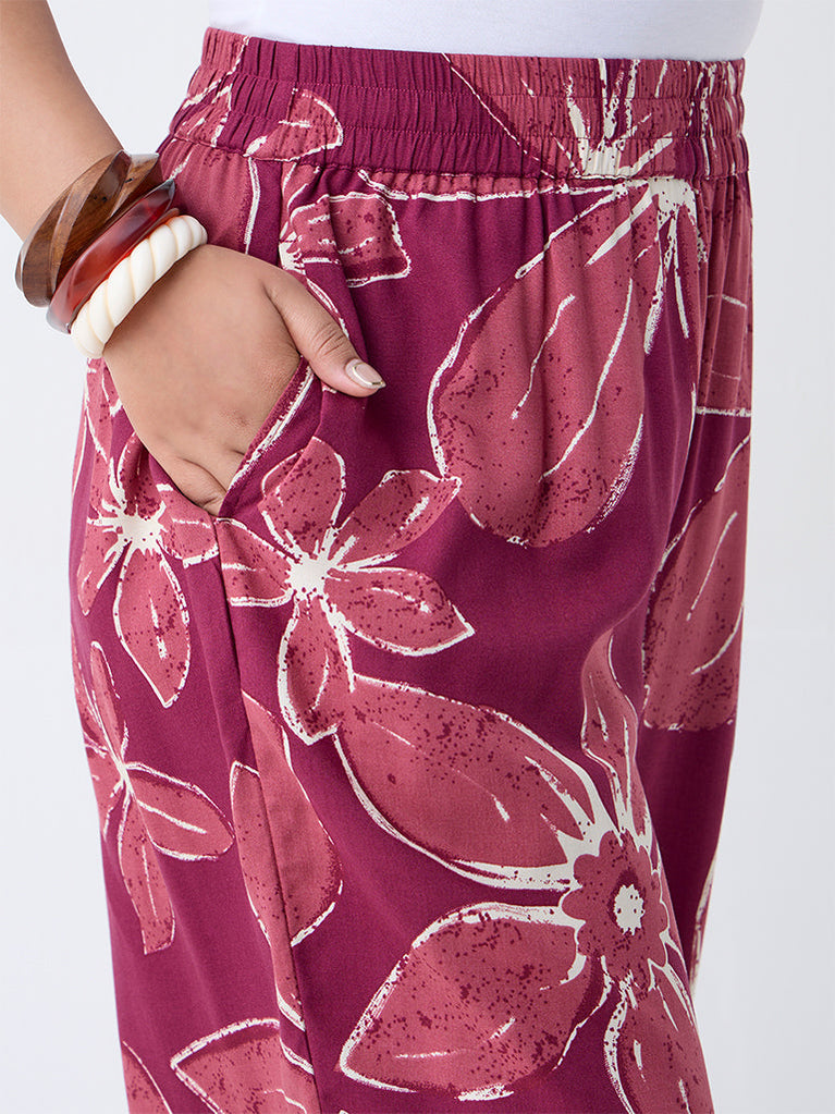 Style and comfort go hand in hand with these plum ethnic palazzos from Diza. Crafted from soft, breathable fabric and patterned with floral motifs, they strike the right balance between relaxed and refined. The elasticated waistband and side pockets ensure effortless movement, making them the perfect foundation for festive pairings that feel easy yet elevated.