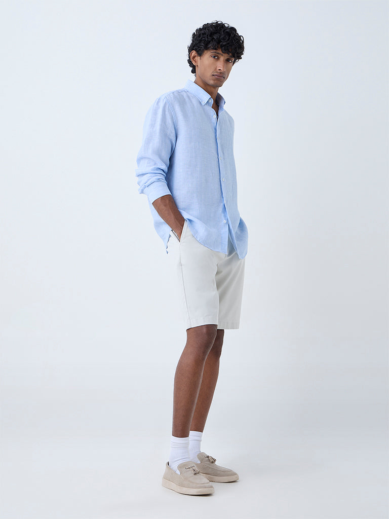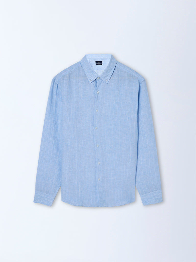 Rendered in a crisp blue hue, this linen shirt from Ascot blends relaxed tailoring with quiet luxury. Woven from a premium fabric, it’s finished with stripe motifs, a button-down collar, and full sleeves with buttoned cuffs. Ideal for refined, warm-weather dressing with a modern edge.