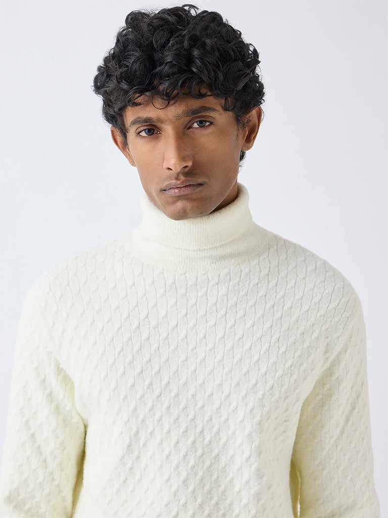 Ascot introduces a cream sweater that blends winter comfort with effortless elegance. Crafted in a relaxed fit from a premium warmth fabric, it features a snug turtle neck and a cable-knit pattern that adds depth and texture. A go-to layering staple for crisp commutes and easy weekend lounging alike.