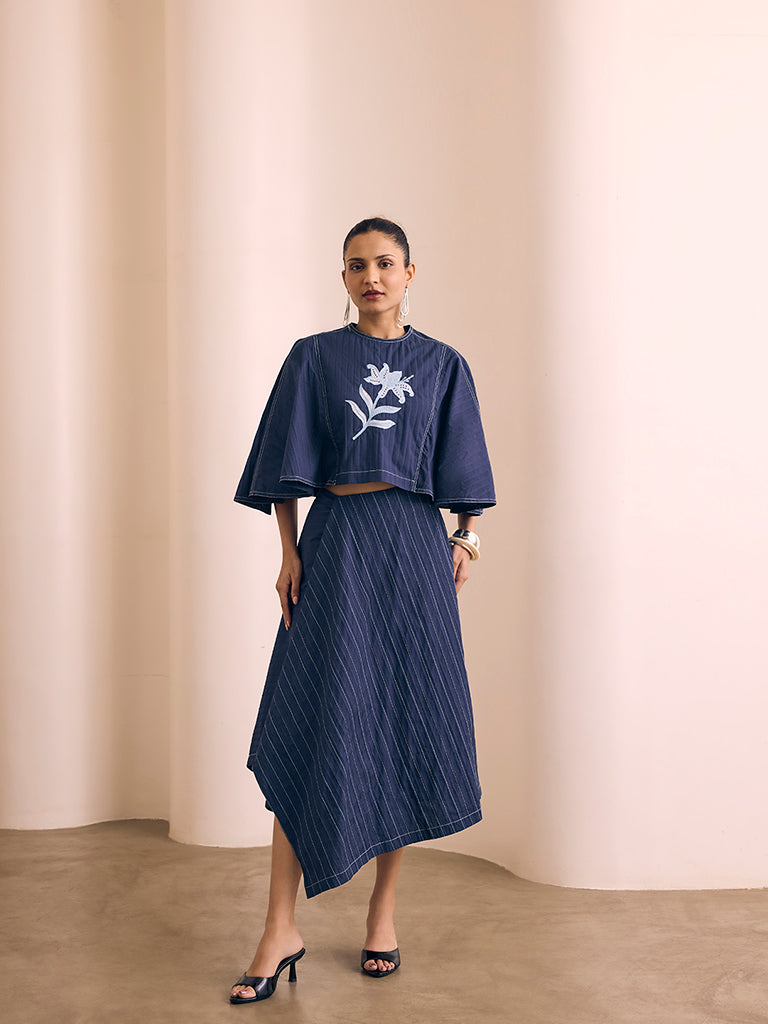 Introduce modern fluidity into your wardrobe with this navy midi skirt, cut in an asymmetric silhouette that creates soft movement with every step. Fine embroidered pinstripes run through the fabric, lending a tailored edge to the relaxed drape. Finished with a discreet zipper for easy wear and functional pockets, it pairs effortlessly with statement tops and contemporary separates.