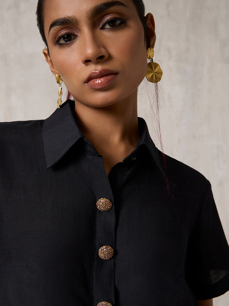 Sharp yet effortless, this black cropped shirt is elevated by ornate metallic buttons that glint softly against its matte texture. Cut in a boxy silhouette with cuffed short sleeves and a classic collar, it blends structure with ease. Pair it with wide-leg trousers or high-waisted skirts for a look that’s timeless, tailored, and quietly bold.