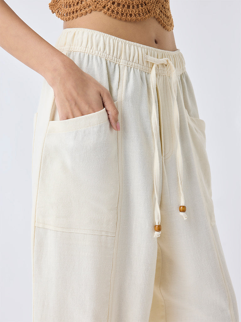 Casual sophistication meets effortless ease in these cream pants from Bombay Paisley. Designed with a smooth elastic waistband, adjustable drawstrings, and practical side pockets, they offer a versatile silhouette that seamlessly moves with you from dawn to dusk.