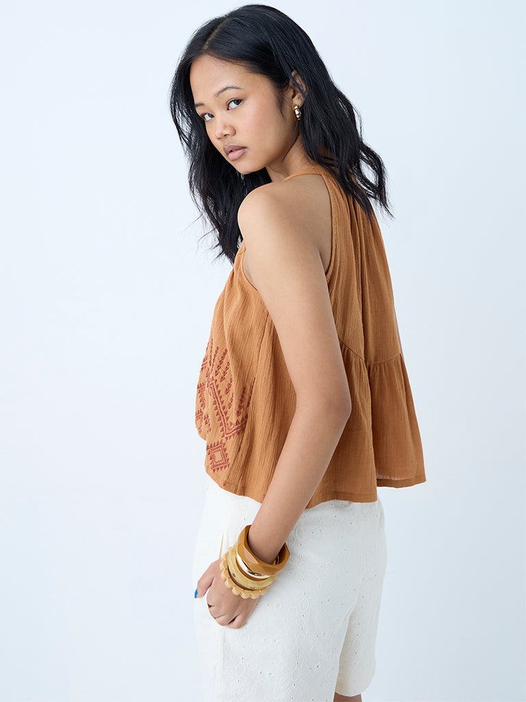 This mustard top from Bombay Paisley is a sunlit staple with embroidered work lending subtle texture. Milled from pure cotton, the sleeveless silhouette is framed by a flattering keyhole neck with adjustable drawstrings for added style.