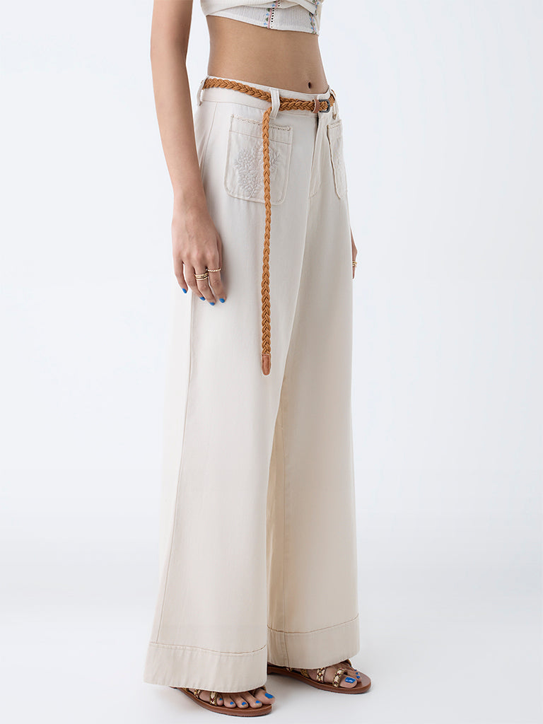 Infuse your day with breezy sophistication in these wide-leg off-white pants by Bombay Paisley. Crafted from pure cotton, they feature belt loops, a button closure, and a zipper placket for a structured yet relaxed fit. The front pockets highlight tonal floral embroidery, adding a subtle touch of artistry, while the braided belt completes the look.