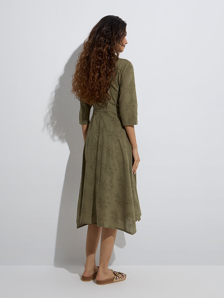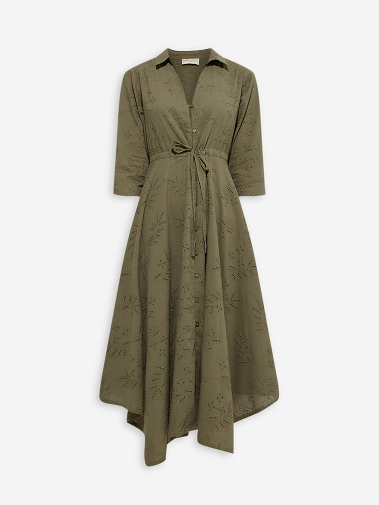 Bombay Paisley introduces this olive dress adorned with intricate schiffli detailing. Spun from pure cotton, it features a V-neck collar extending to a button placket and three-quarter sleeves. The drawstring waist adds a customizable fit, defining the silhouette with effortless charm.