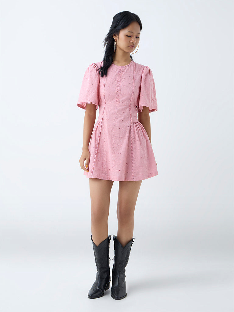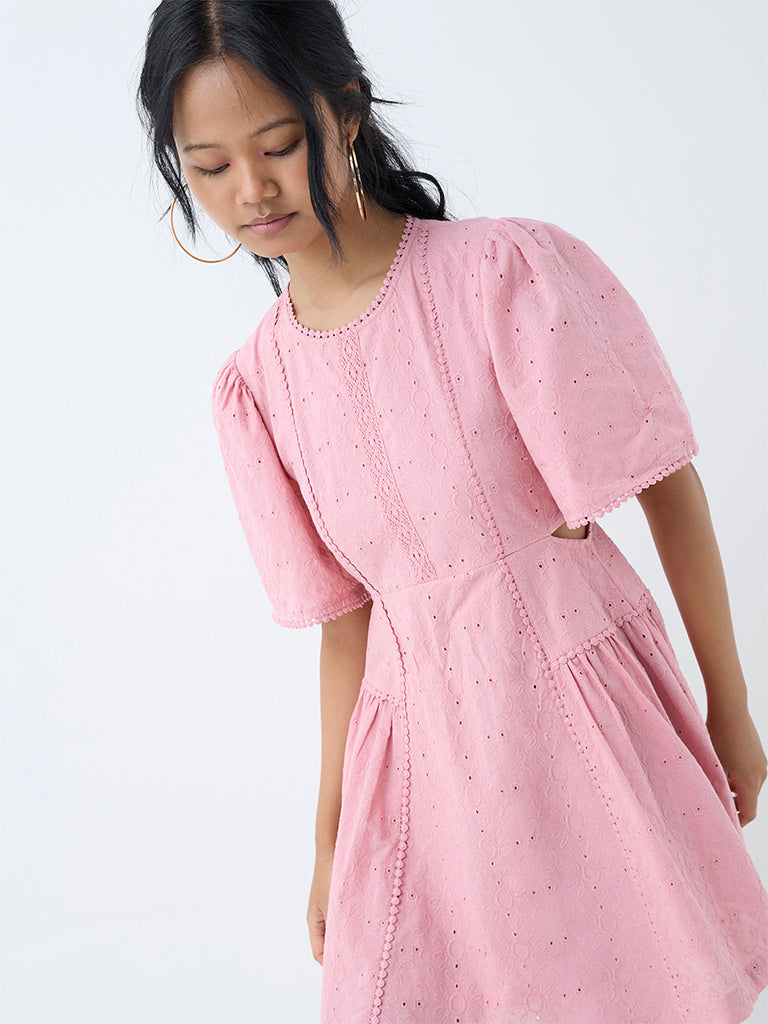 Fashioned with intricate floral embroidery that catches the light, this pink dress by Bombay Paisley features a stylish cut-out at the waist for an unexpected edge. Angel sleeves lend a fluttery grace, while the pom-pom trimmed neckline nods to artisanal detail. Finished in a breezy A-line frame, it's a feel-good favourite made for golden hour and beyond.
