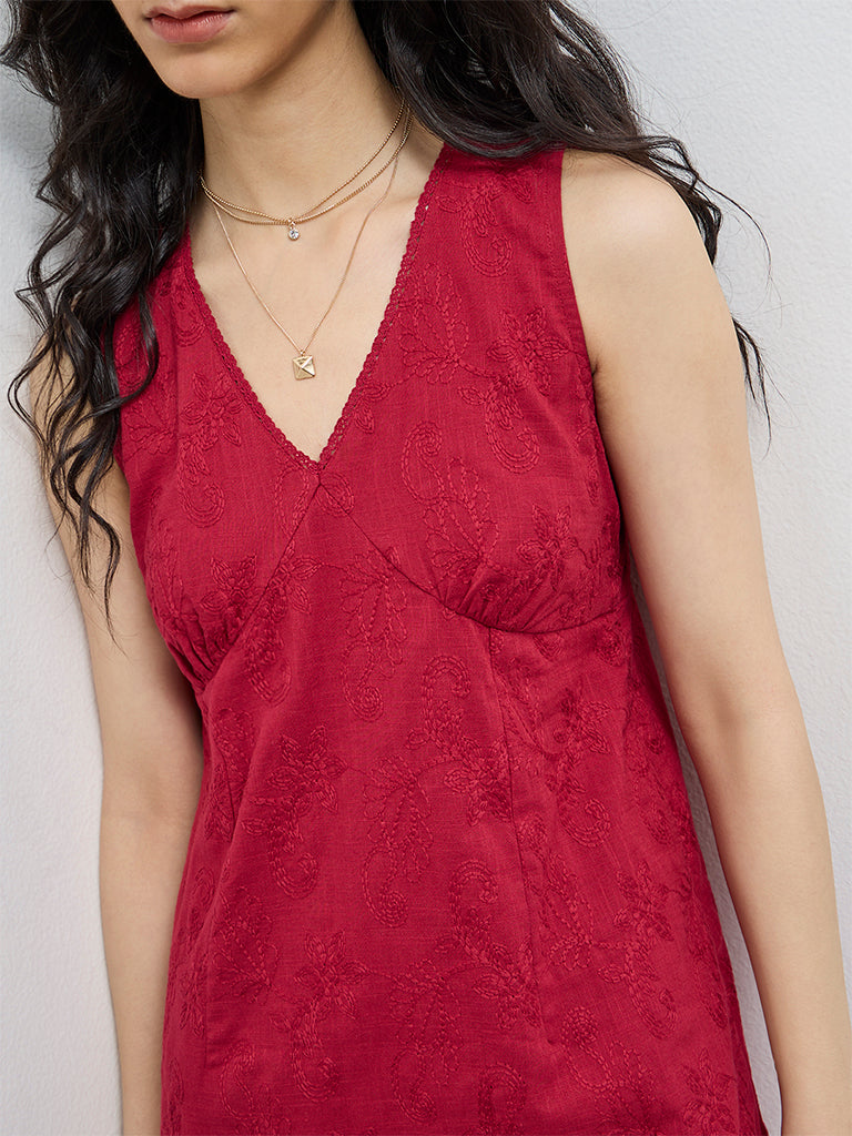 Bombay Paisley presents this crimson-hued cotton dress designed in a clean red straight silhouette. The sleeveless cut is complemented by a deep V-neckline, while underbust stitch-detailing shapes the form. Subtle floral embroidery is worked across the fabric, adding delicate texture and a handcrafted finish to the breathable cotton base.