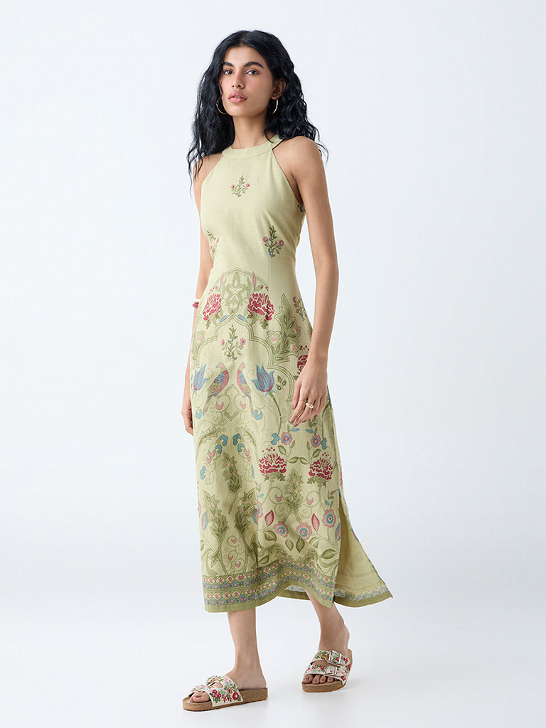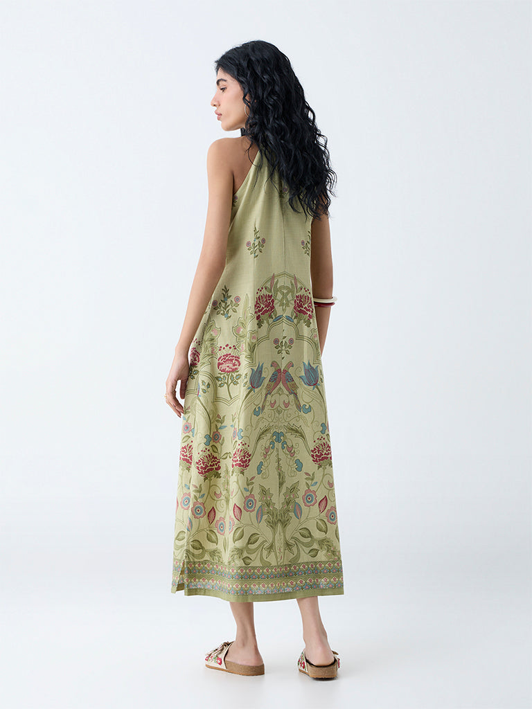 This sage dress from Bombay Paisley is made for days in the sun. Constructed from pure cotton in an A-line silhouette, it showcases botanical motifs and a halter neck that create a chic look. Pair it with strappy sandals and a woven tote for an easy daytime look.
