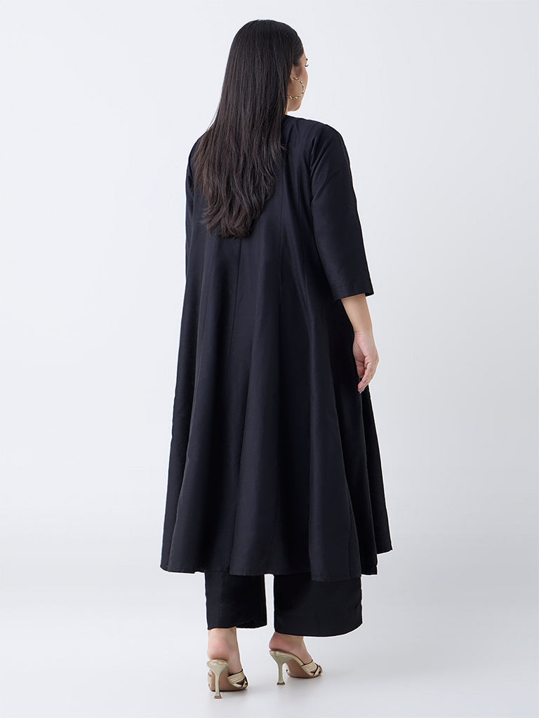 Infused with artisanal grace, this black kurta by Diza is detailed with floral embroidery and subtle embellishments for a festive sparkle. The Anarkali silhouette flows elegantly, balanced by a flattering V-neck and three-quarter sleeves. Side pockets add a modern touch of ease to this traditional design.