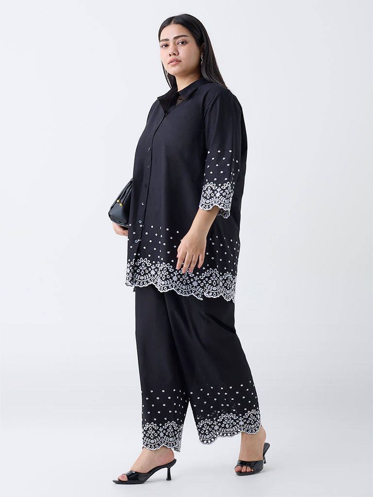 Diza black tunic showcases intricate schiffli embroidery for a distinctly festive appeal. Crafted from a cotton-rich fabric that offers structure with softness, it features a classic collar, button placket, and 3/4th sleeves finished with scalloped edges for a beautifully feminine finish.