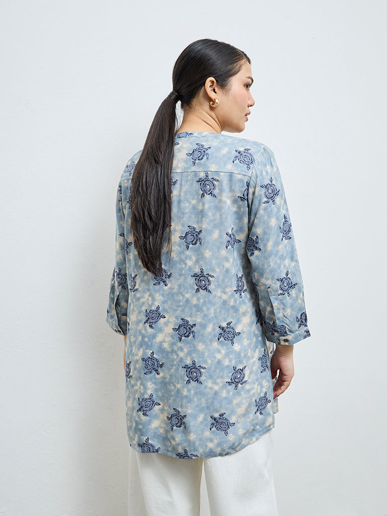Made for daily ethnic dressing, Diza introduces this blue tunic featuring tortoise prints set on an easy silhouette. Milled from a lightweight fabric that feels gentle on the skin, it is styled with a mandarin neckline, a short button placket and three-quarter sleeves.