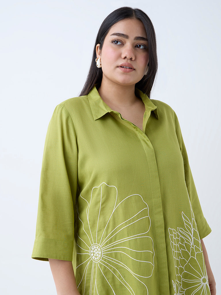 This lime ethnic tunic from Diza is defined with floral embroidery that amplifies its minimal base. Made from a breathable fabric for easy comfort, it is styled with a crisp collar, a concealed button placket and three-quarter sleeves for a breezy fit.