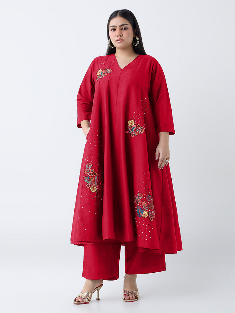 Infused with artisanal grace, this red kurta by Diza is detailed with floral embroidery and subtle embellishments for a festive sparkle. The Anarkali silhouette flows elegantly, balanced by a flattering V-neck and three-quarter sleeves. Side pockets add a modern touch of ease to this traditional design.