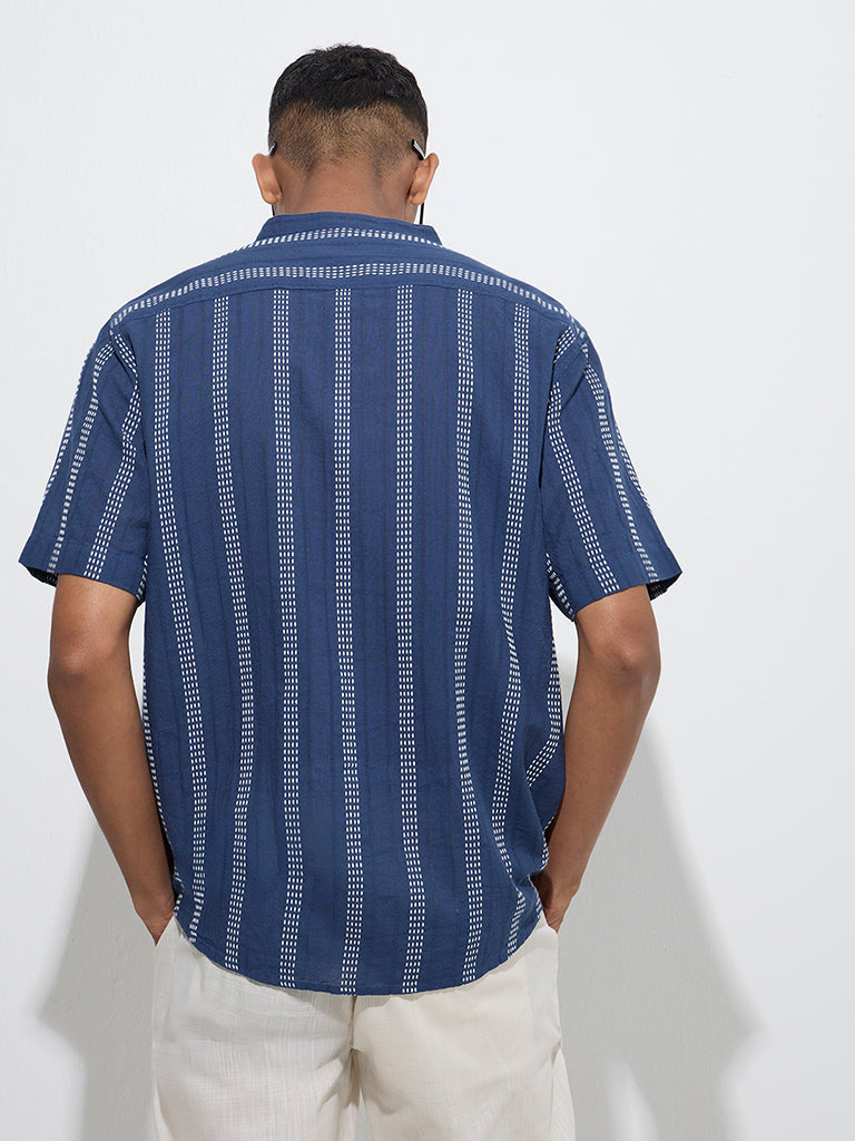 Embroidered with stripe patterns, this indigo shirt from ETA offers a refined yet casual appeal for warm-weather dressing. Spun from a cotton-rich fabric in a relaxed silhouette, it is styled with a mandarin collar, button placket, and half sleeves for everyday comfort.