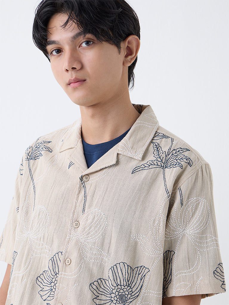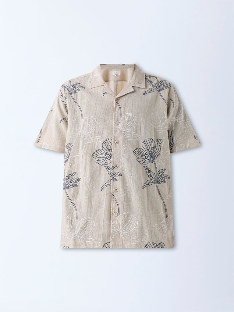 ETA Light Beige Floral Embroidered Relaxed-Fit Cotton Shirt