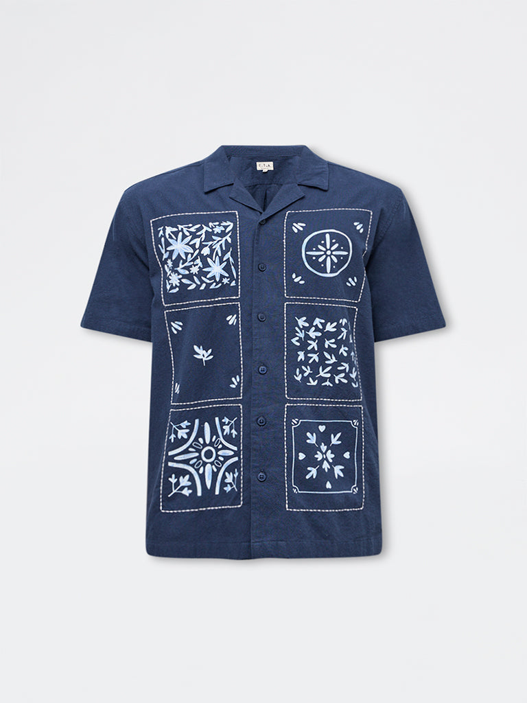 Channel easy summer dressing as ETA presents this navy shirt detailed with printed accents at the front. Crafted from pure cotton for breathable comfort, it features a camp collar, button placket, and short sleeves in a relaxed handle.