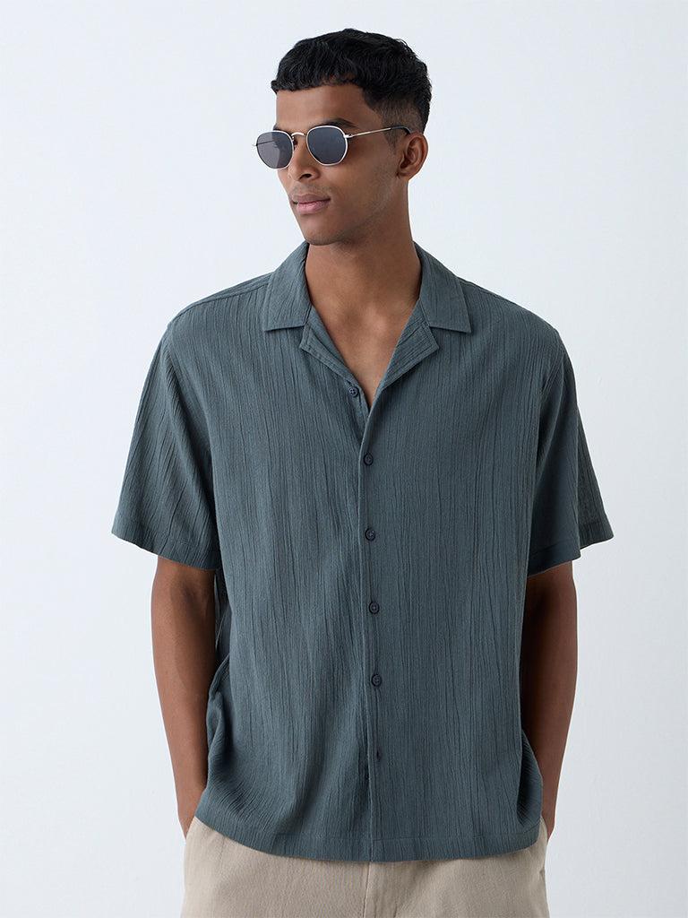 ETA Teal Crinkle-Textured Relaxed-Fit Cotton Shirt